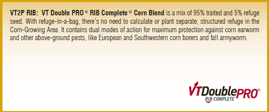 VT Double PRO® RIB Complete® Corn Blend is a mix of 95% traited and 5% refuge seed. With refuge-